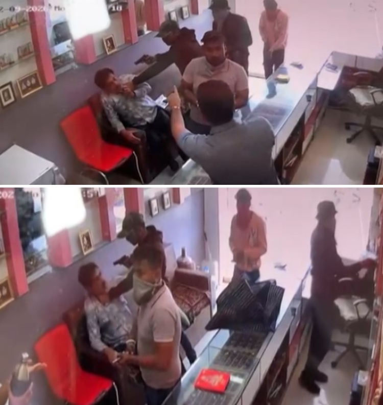 સતર્ક દુકાનદારે પોતાનો કિંમતી માલ બચાવવા માટે દુકાન લૂંટીને પાછાં જવા પ્રયાસ કરી રહેલાં એક શખ્સને દબોચી લઈ રાડારાડ કરતાં લૂંટારુઓ ફાયરીંગ કરીને નાસી છૂટ્યાં હતા.
