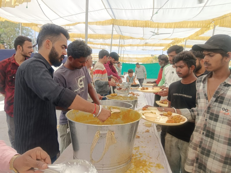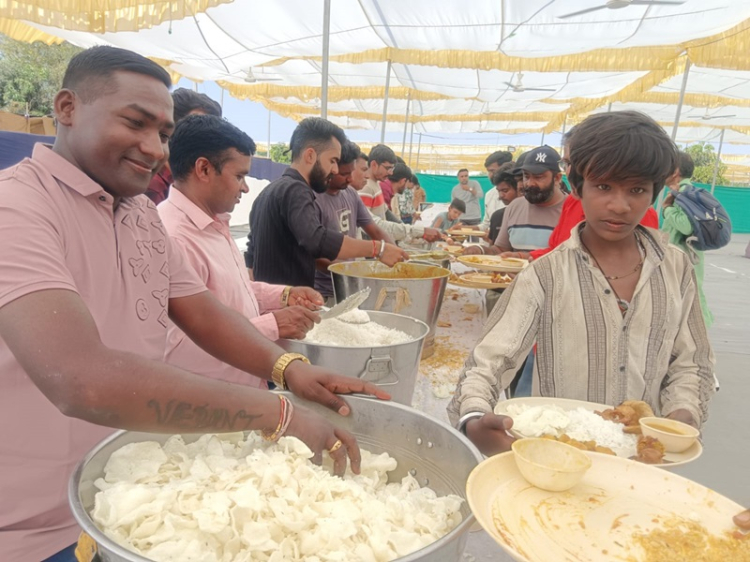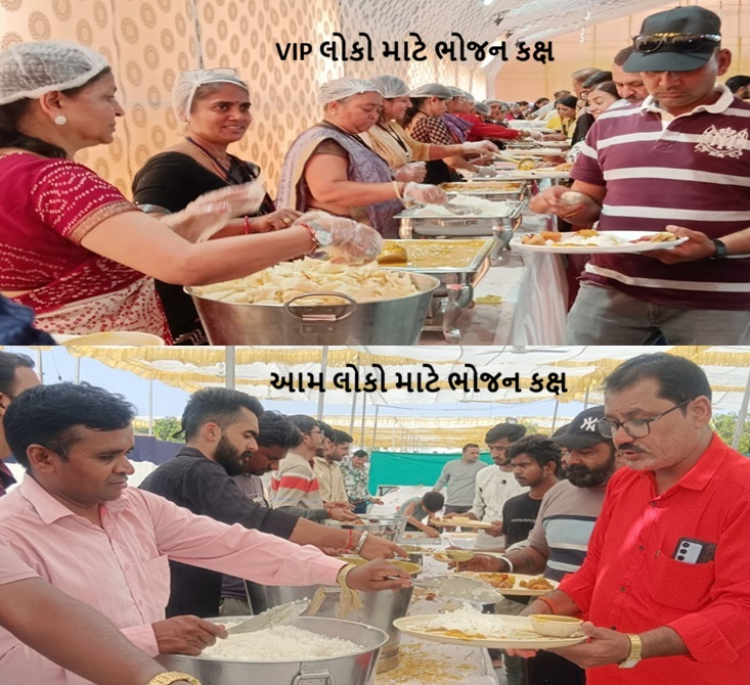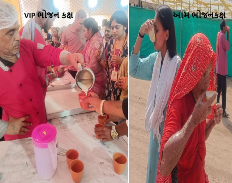ભોજન માટે નજીક નજીકમાં બે જુદાં જુદાં મોટાં શામિયાણામાં વિશાળ ભોજન કક્ષનું આયોજન કરાયું છે. એક ભોજન કક્ષ આમલોકો માટે છે, જ્યાં ભારે ભીડ ધક્કામુક્કી વચ્ચે લોકો માંડ માંડ થાળીમાં ભોજન લઈ આરોગે છે. તેની નજીકમાં ખાસ લોકો માટે વીઆઈપી ભોજન કક્ષ છે.